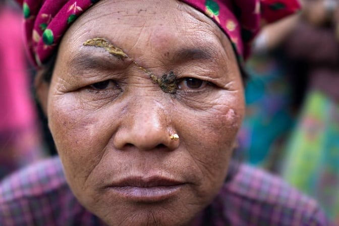 Ursung Tamang, 48, sustained cuts to her face when her house collapsed. Portrait taken at MSF mobile clinic, Kuni village, Dhading district. Photo: Brian Sokol