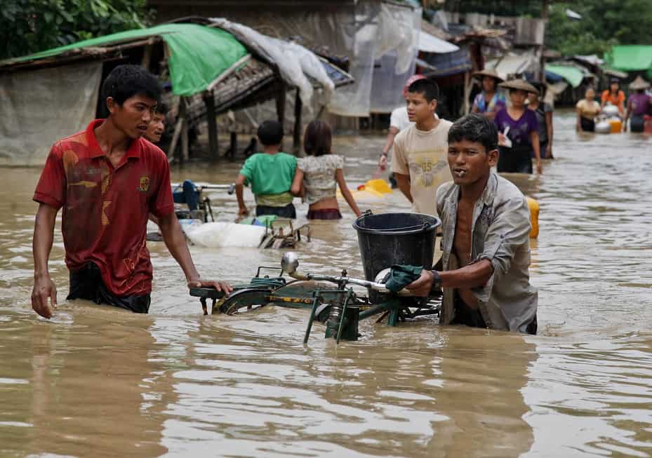 A picture made available on 04 August 2015 shows people carrying their belongings as they pass through a flooded street in Min Pyar township of Rakhine State, Myanmar, 02 August 2015. Myanmar’s president declared four regions of the country as disaster zones on 31 July 2015. Heavy monsoon rains caused floods around Myanmar with dozens of deaths being reported as thousands are fleeing their homes in several regions across the country. In Myanmar monsoon starts at the beginning of June and ends in September.