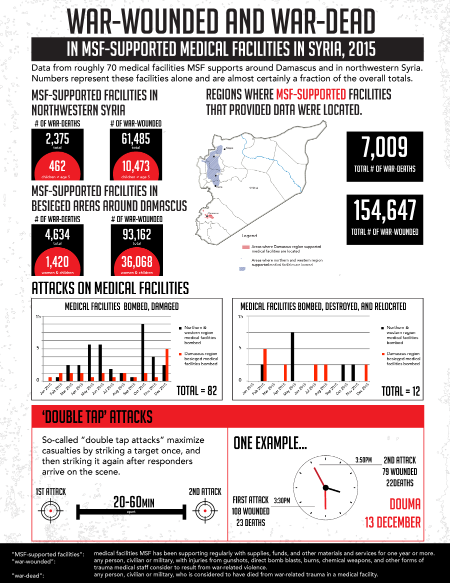 Equally shocking are the101 aerial or shelling attacks that struck MSF-supported facilities over the last 13 months. Several were struck twice after the arrival of medical and rescue personnel. Patients have told us they’re now too afraid to go to hospitals.