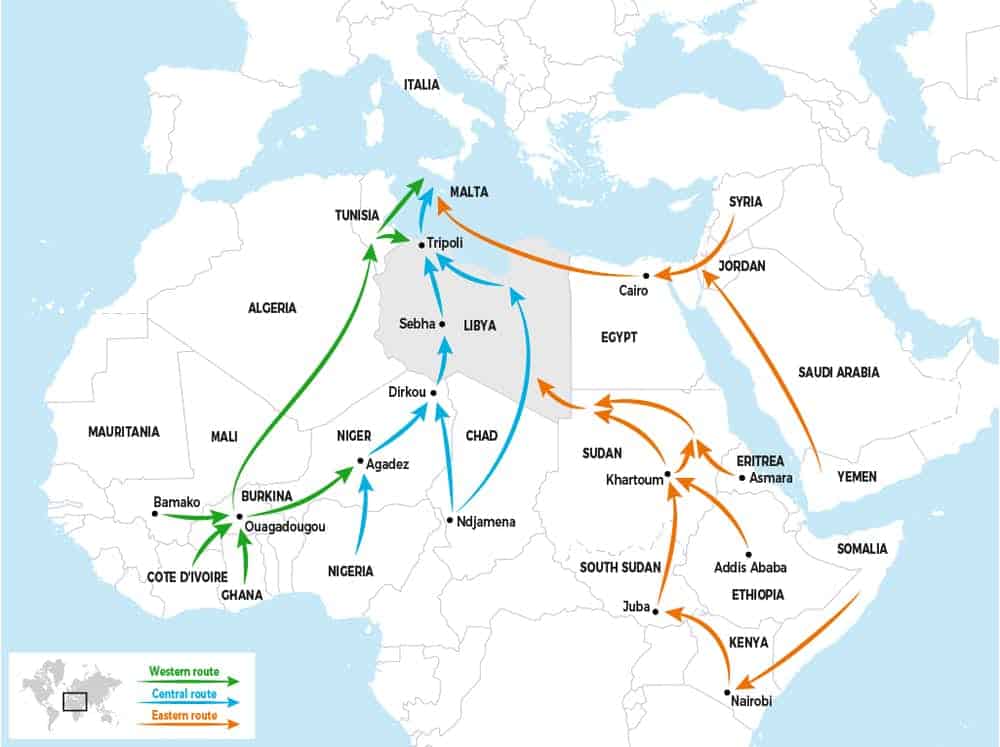 Migration routes – a map showing the three main migration routes through different points in Africa, with all arriving in Libya where people attempt to cross the Mediterranean Sea. © AURELIE BAUMEL/MSF