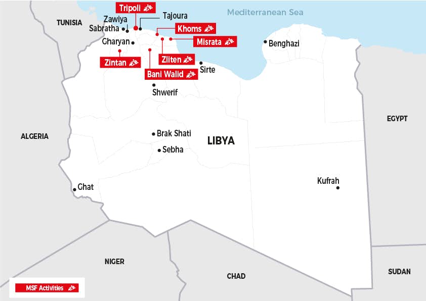 Map showing where MSF provides medical care and assistance at several migration hotspots, including detention centres, in Libya. © AURELIE BAUMEL/MSF