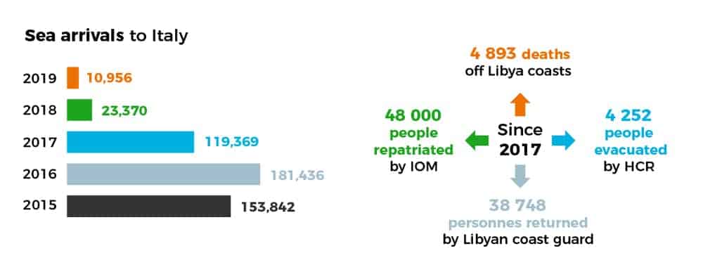 The UNHCR has evacuated nearly 3,000 refugees from Libya to a transit centre in Niamey, Niger since late 2017. A similar mechanism has been set up in Romania, and another was launched in September 2019 in Rwanda. Apart from Italy, no state has organised humanitarian evacuation flights for refugees directly from Libya.