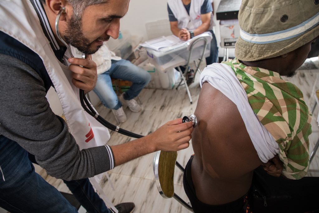 An MSF doctor gives a detainee in the Dahr-el-Jebel detention centre a medical checkup. The centre holds nearly 500 people, most from Eritrea and Somalia. Libya, October 2019.