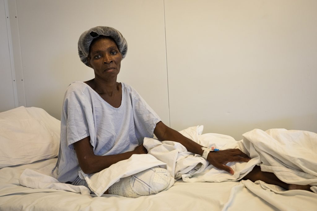 Clotilde, 52 years old, was hit by a stray bullet in her right leg during a clash between rival gangs. She first went to the MSF emergency and stabilisation centre in Martissant, before being transferred to the MSF hospital in Tabarre.