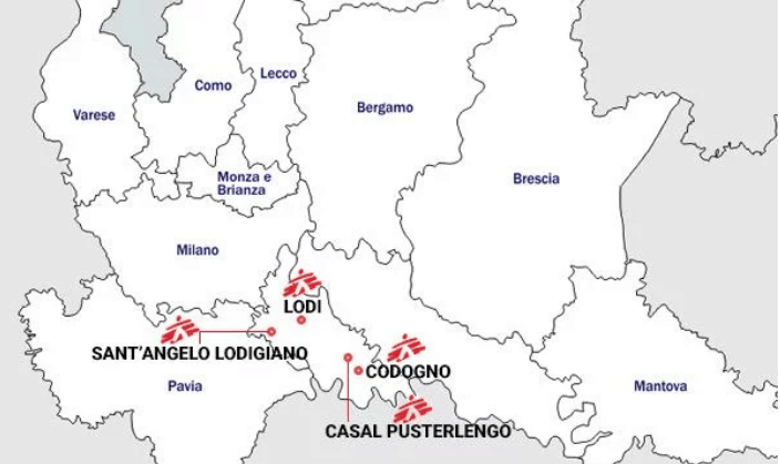 Locations in Lodi province, Italy where MSF staff are working in hospitals on COVID-19 response. March 2020.