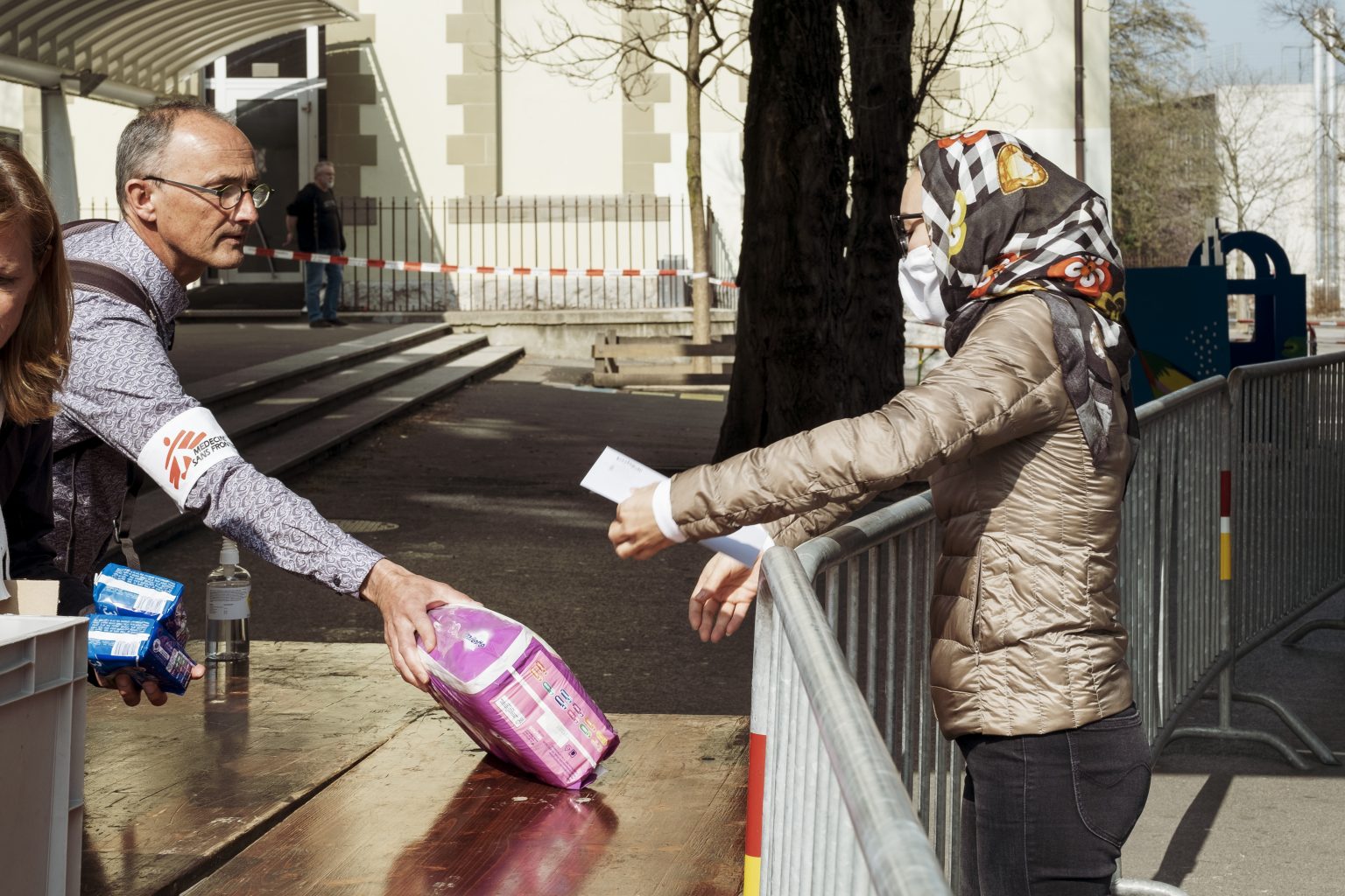 28 March 2020: As part of our COVID-19 response in Switzerland, we are distributing hygiene products and food vouchers to 2,700 vulnerable people in Geneva. MSF logisticians ensure that the distribution circuit set up by volunteers and the city’s services is arranged in such a way as to minimise physical contact and thus the risk of contamination. © Nora Teylouni/MSF