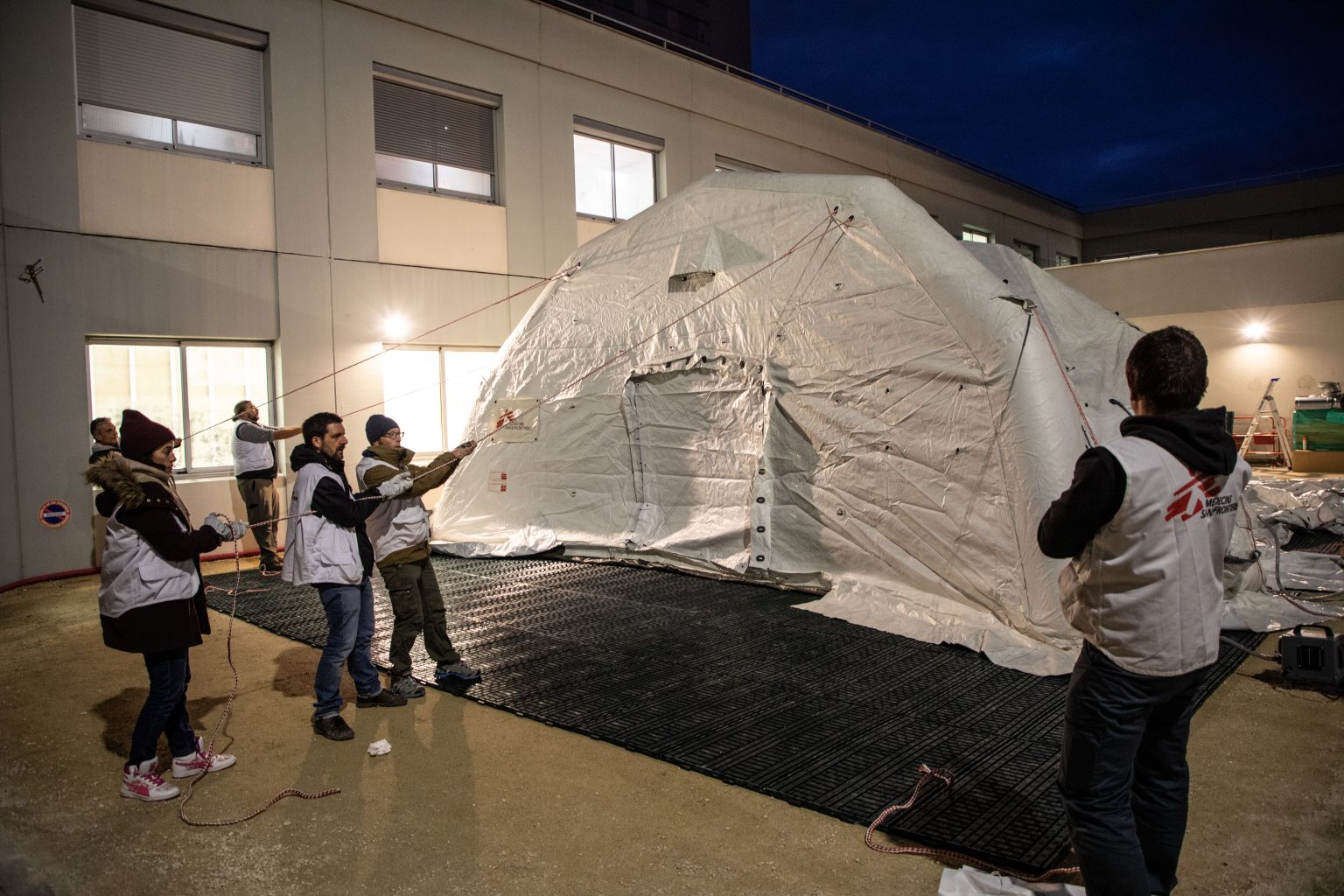 4 April 2020: An MSF team of logisticians and water and sanitation experts set up a medical care tent at Reims University Hospital in Reims, France, to increase its intensive care capacity. © Agnes Varraine Leca/MSF