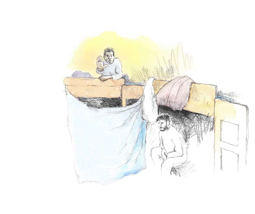 “In the [refugee] camp we live five or six to a container. I know that I can’t stop people coming in to see my room-mate and I have no choice but to gesture to people to keep away.”
