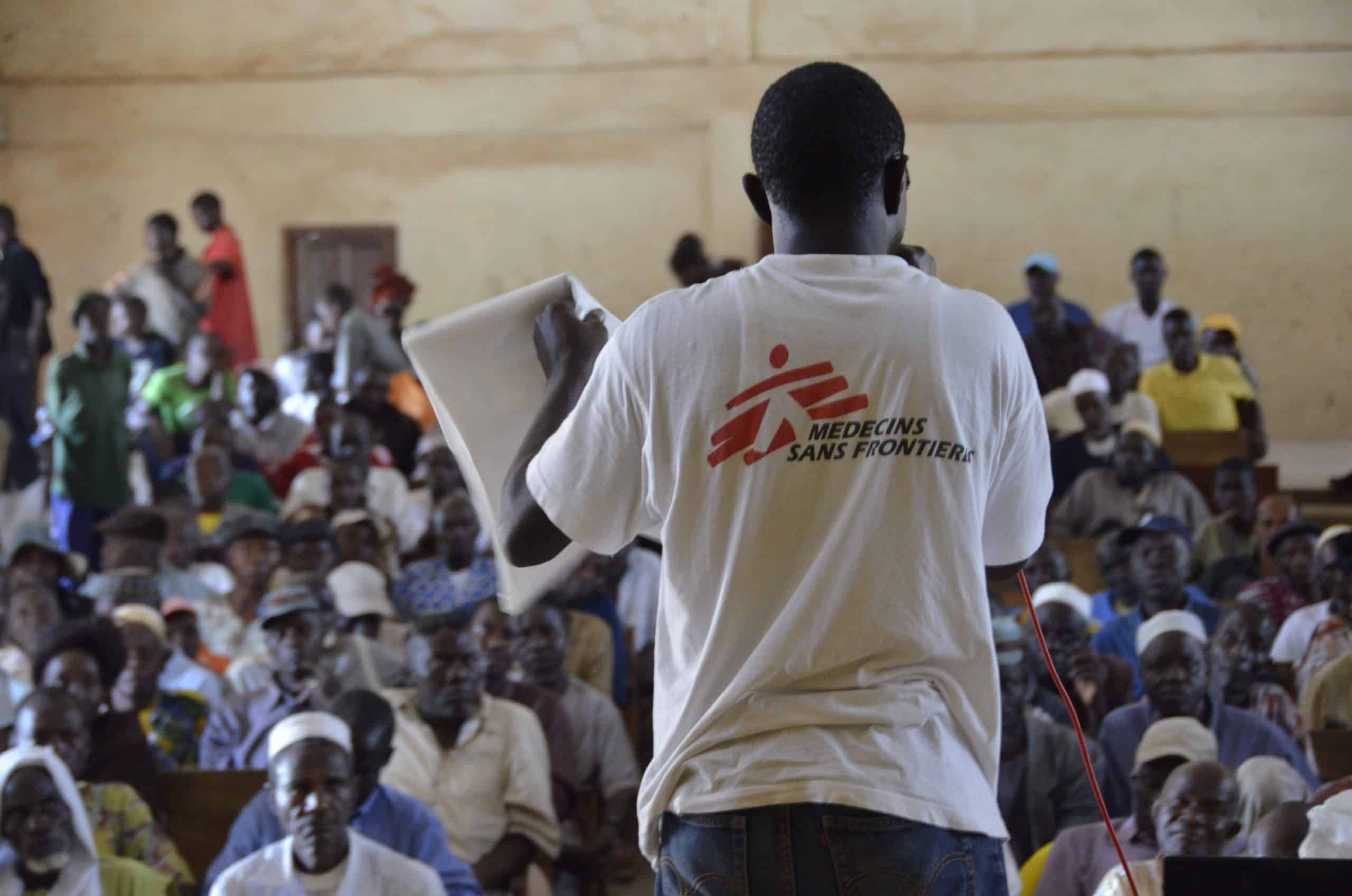 An MSF staff member engages with all the heads of villages from the Macenta region in Guinea to discuss the response during the 2014 – 2016 West Africa Ebola epidemic. Guinea, October 2014. Photo: JULIEN REY/MSF