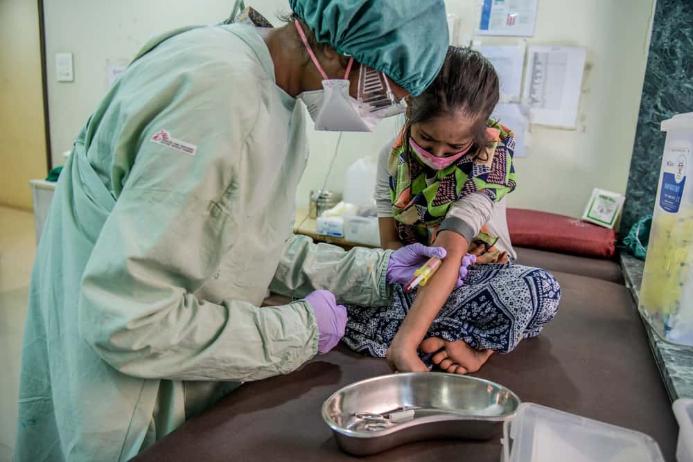 MSF Nurse drawing blood sample of of 10 years old girl, XDR-TB survivor during her post treatment 6 monthly follow-up at MSF independent Clinic, Mumbai-India. Photo: ATUL LOKE