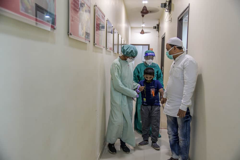 An MSF nurse accompanying a nine-year-old XDRTB + EPTB survivor to ECG Room at MSF independent clinic in Mumbai, India. Photo: Atul Loke
