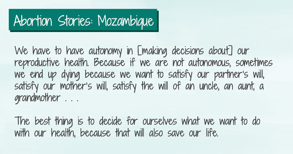 We should be thankful in Mozambique that abortion is legal now—that we don’t need to use unsafe methods that can harm us. I was one of those who used an unsafe method. I was lucky to have been treated.