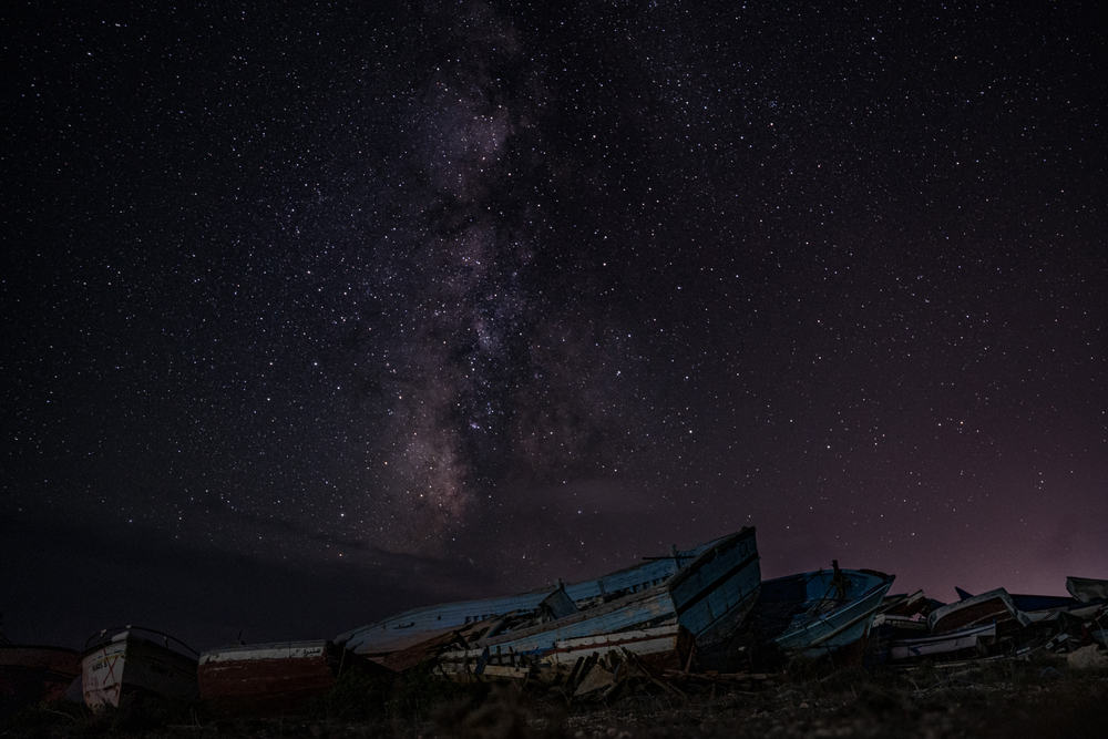 The Milky Way rises on the remains of the ‘boat cemetery’ of Lampedusa. The boats used by people crossing the Mediterranean sea are pulled out of the water, brought on to the beach and piled up in strategic points on the island, before being demolished. Lampedusa, Italy, September 2021.