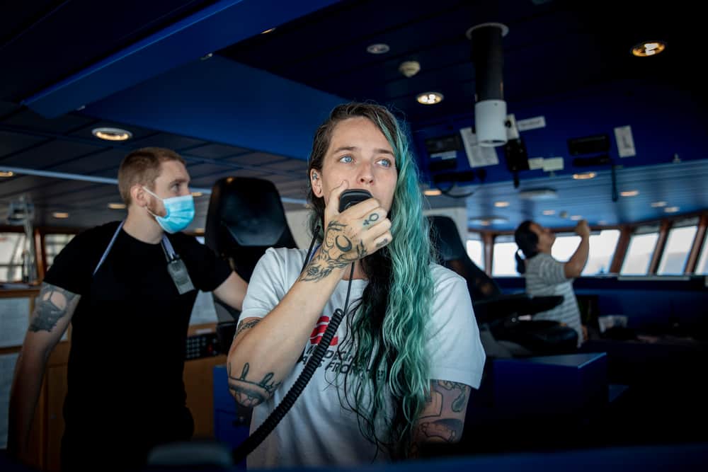 A member of the MSF team on board search and rescue ship the Geo Barents, communicates with the aerial observation plane Colibri, from Pilotes Volontaires, which has spotted a rubber boat in distress carrying 54 people. Central Mediterranean Sea, September 2021.