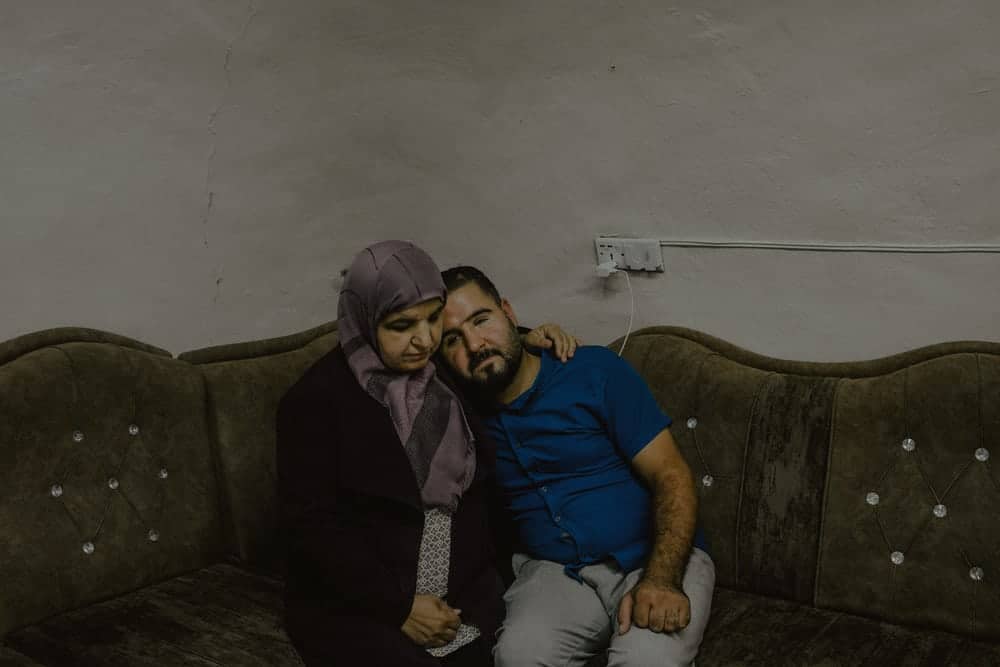 Kuzal (left) sits together with her son in her house; she is a midwife in the Nablus MSF hospital. The Islamic State group forced her to work during the war; her son would drive her to work every day. Mosul, Iraq, September 2021.