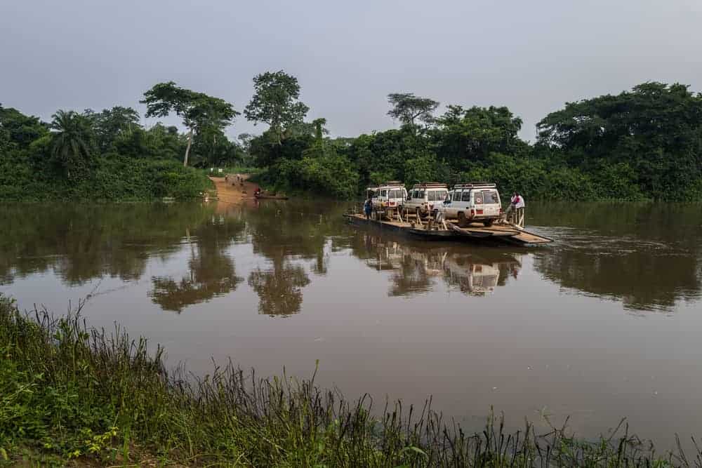 An MSF convoy crosses the river on the way back to Bangassou, following a mobile clinic session in Nzacko. Central African Republic, July 2021.