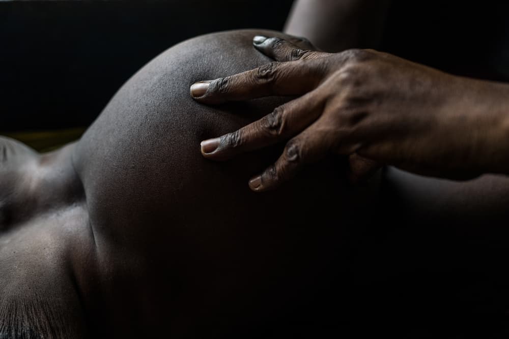 Midwife Sylvie feels the pregnant belly of Octavie, who, after complications and five hours of labour, delivers a healthy baby boy at Nzacko health centre. Central African Republic, July 2021.