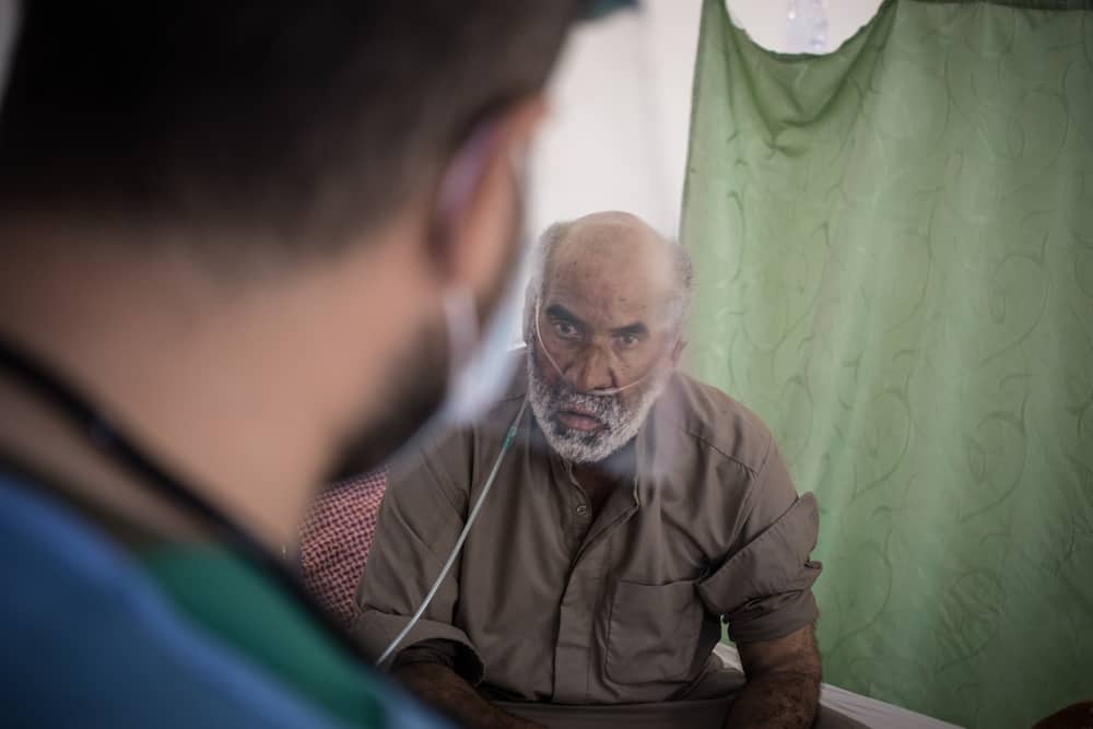Mr Ali sits on his bed receiving oxygen, while head nurse Abdul Harma provides him with care, at the COVID-19 hospital in Hassakeh. Syria, June 2021.
