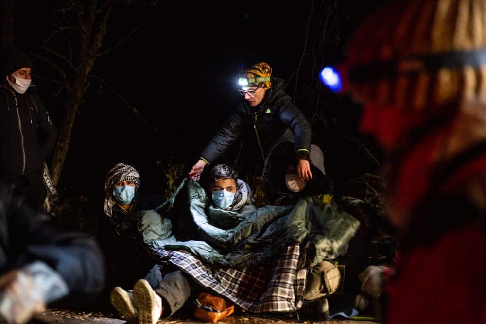 A volunteer from Polish organisation Fundacja Ocalenie covers refugees with sleeping bags. An MSF team accompanied a team from Fundacja Ocalenie into a forested area near the Polish/Belarusian border, where they met a family of 13 Iraqi Kurds, including four children, on the Polish side. The family asked for asylum in Poland and were taken by the Polish border guards back to the emergency state zone at the Belarusian border. The next day, they sent their location indicating that they were back on the Belarusian side of the border. Narewka, Poland, October 2021.