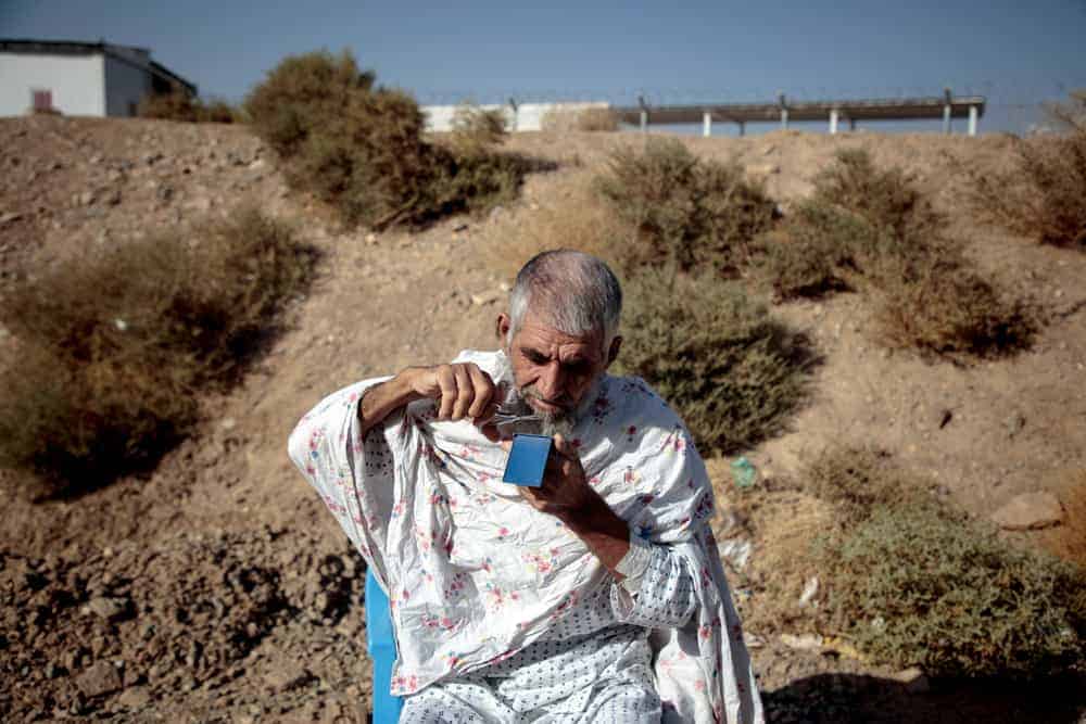 A man trims his beard in the sun outside the MSF COVID-19 hospital in Herat. Afghanistan, October 2021.-