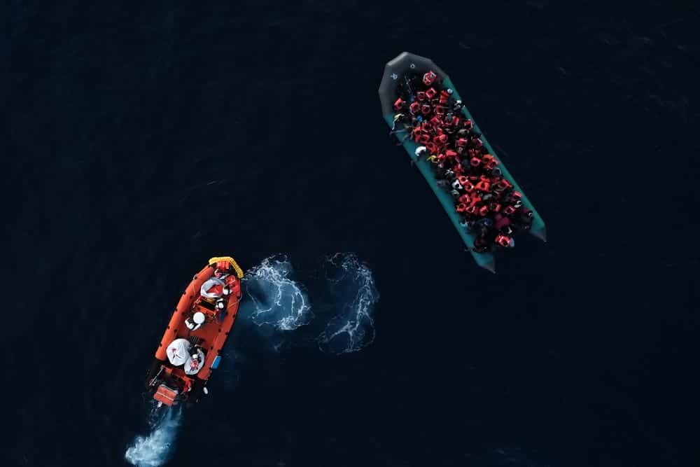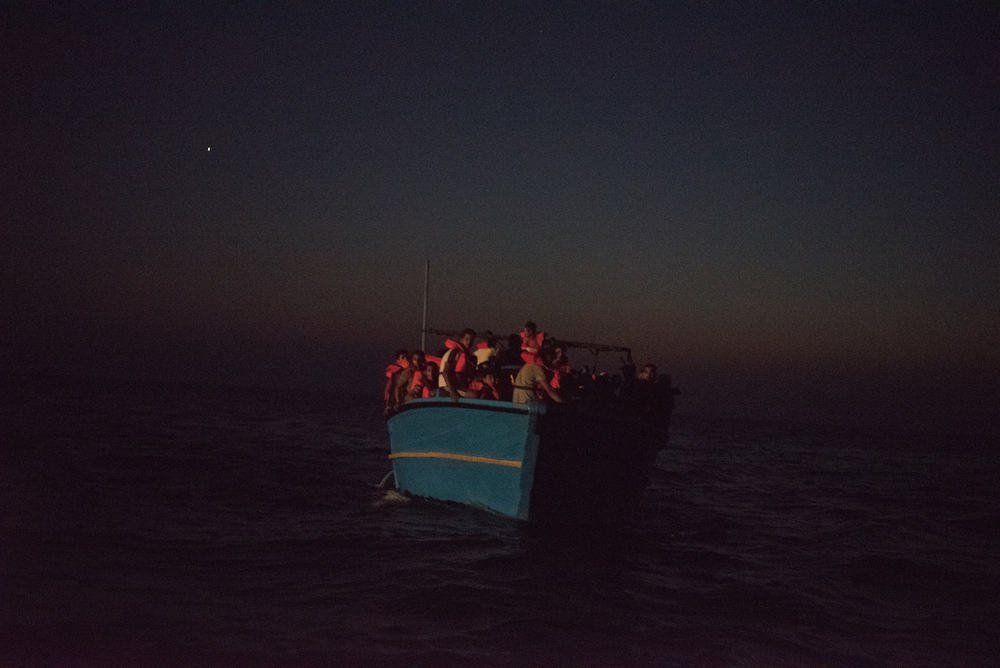 An MSF team from search and rescue ship the Geo Barents reaches a rubber boat with 95 people on board, just before it was intercepted by the Libyan Coast Guard. MSF teams arrived on time to carry out the rescue safely. Central Mediterranean Sea, October 2021.