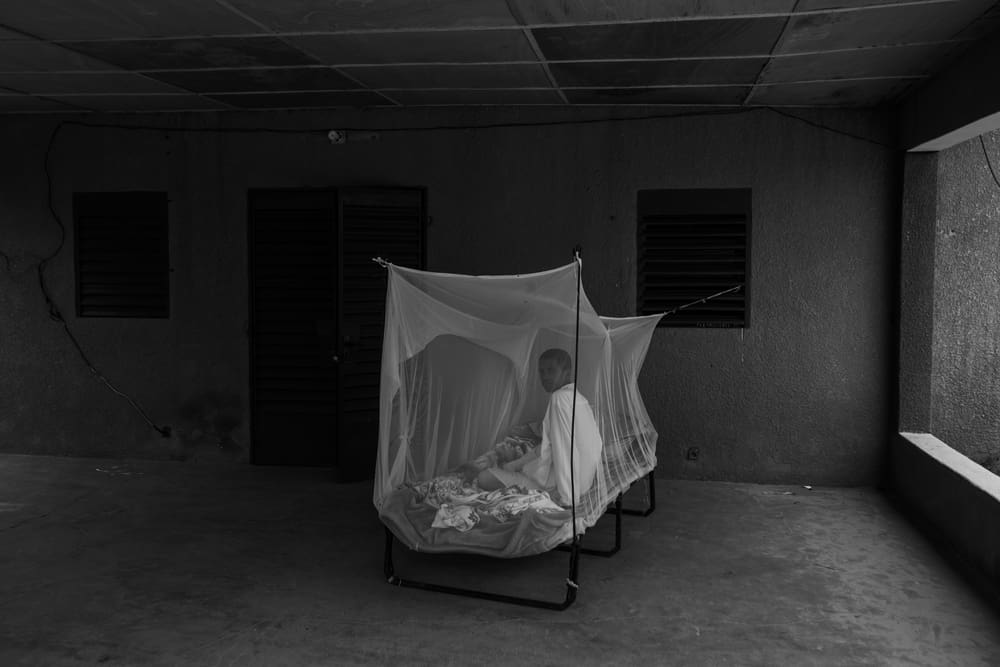 A man sits on a bed under a mosquito net, to help protect him from malaria-transmitting mosquitoes during the rainy season. Zinder, Niger, July 2021.