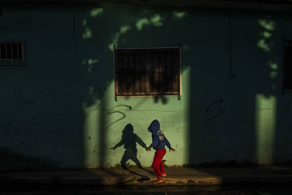 Nine-year-old Ángel plays under the Coatzacoalcos bridge. Since leaving Honduras, he and his family have been travelling for 16 days, 14 of them on foot. Veracruz, Mexico, March 2021.
