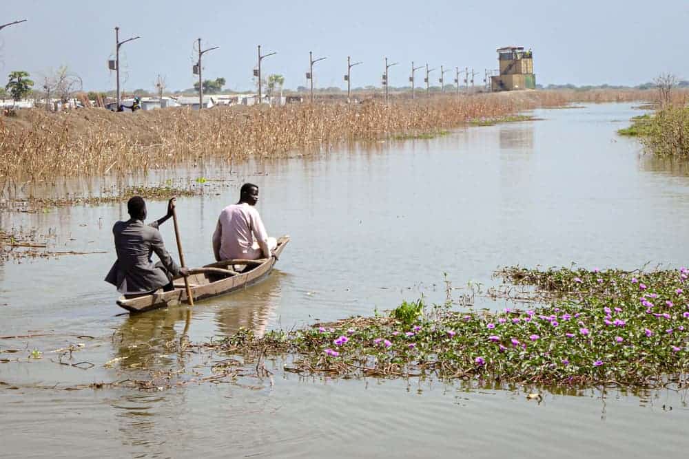 Two men use a canoe to navigate through floodwaters on the outskirts of Bentiu internally displaced people’s camp. South Sudan, November 2021.