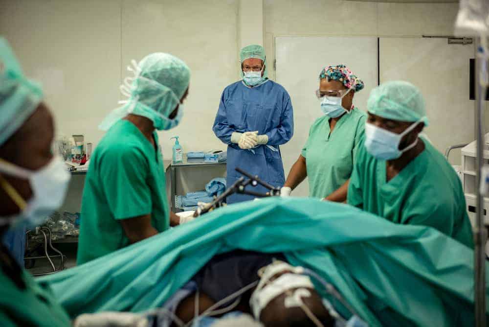 An MSF surgical team prepares to amputate the leg of a patient with a severe leg injury in Tabarre trauma hospital. Port-au-Prince, Haiti, December 2020.