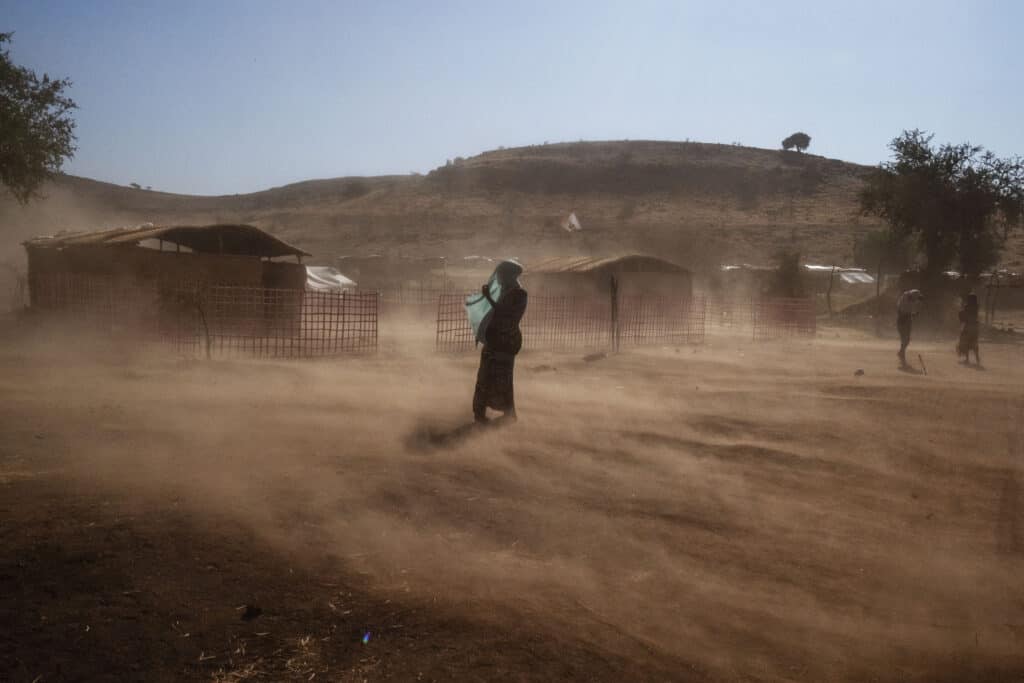 A refugee shields her face from the wind-blown dust in Um Rakuba refugee camp. People fled northern Ethiopia’s Tigray region starting in November 2020 to escape conflict between the military and the local Tigrayan People’s Liberation Front. Gedaref region, Sudan, December 2020.
