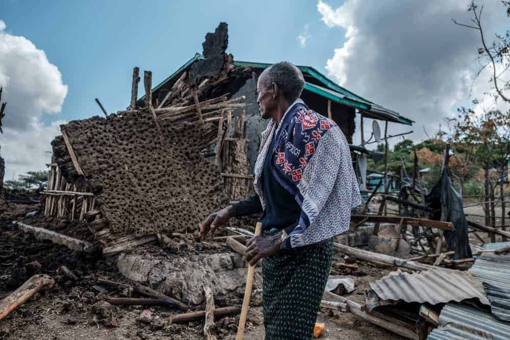 A man surveys his destroyed house in the village of Bisober. Tigray region, Ethiopia, December 2020.