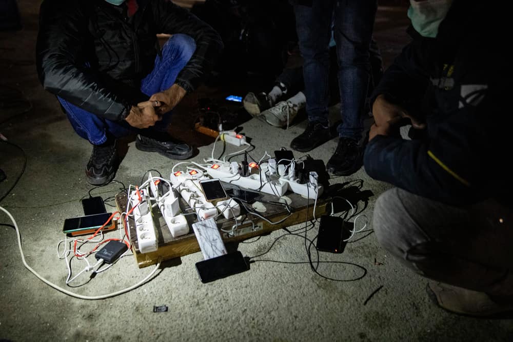 People charge phones and power banks from electrical outlets in a shelter, managed by volunteers, for migrants crossing from Italy to France. Turin, Piedmont region, Italy, December 2020.