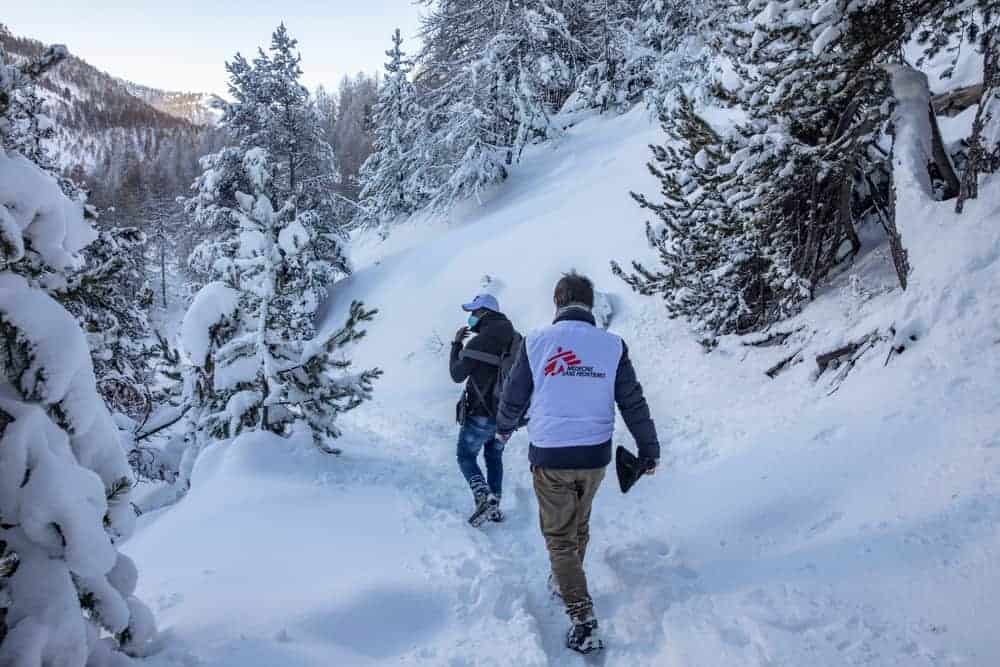 MSF staff walk part of the snow-covered trail in the mountains northwest of Turin, used by people seeking to cross from Italy to France. MSF teams monitor the situation and provide support to a number of volunteer organisations who support migrants making the journey along the trail. Italy, December 2020.