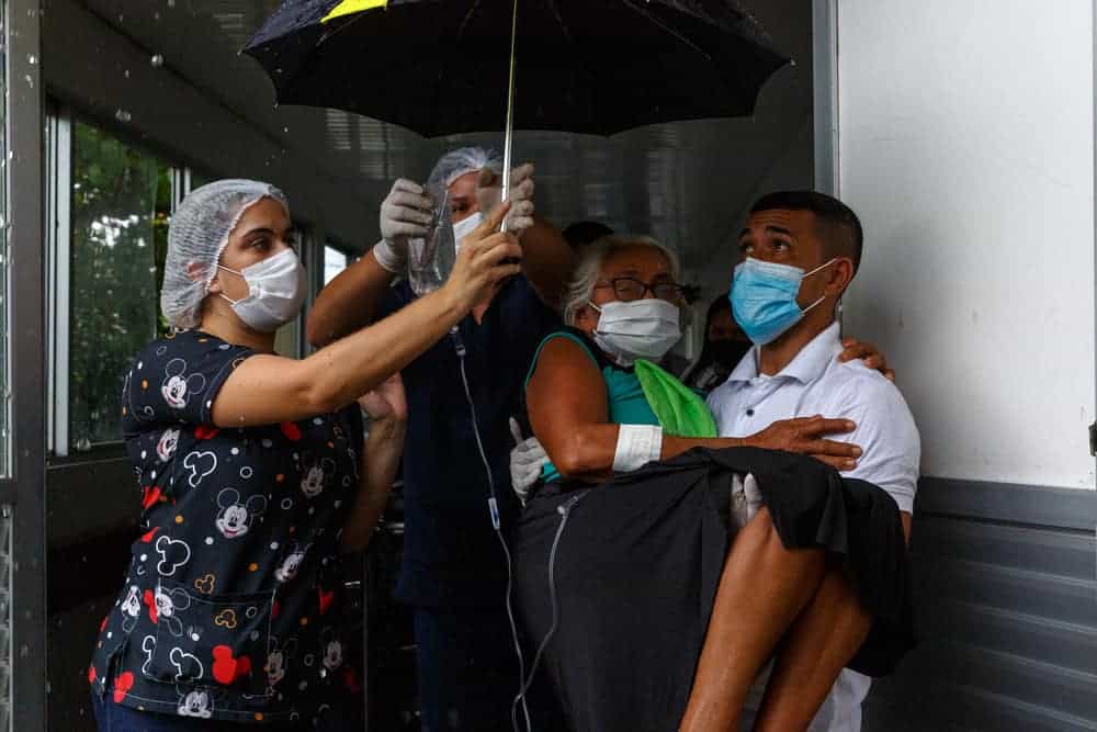 A woman with COVID-19 is carried out to an ambulance, which will take her to the airport to be then transferred to Manaus, the capital of Amazonas state, for further treatment. Tefé, Brazil, December 2020.