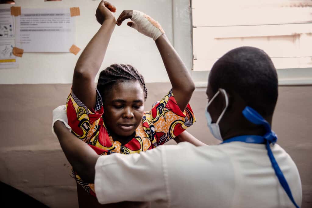 France receives help to get undressed, so that MSF medical staff at SICA hospital can change the dressing and check a chest wound, the result of a stray bullet. Bangui, Central African Republic, February 2021.