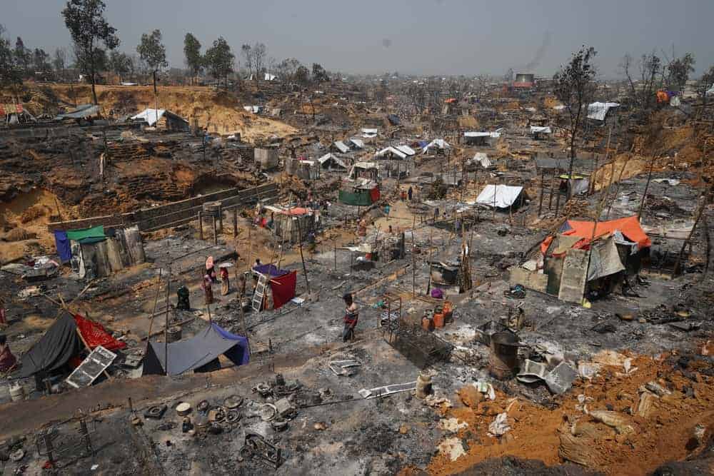 People start to rebuild shelters among the burnt-out remains of a part of Cox’s Bazar refugee camp for Rohingya people that was destroyed by fire. Bangladesh, March 2021.