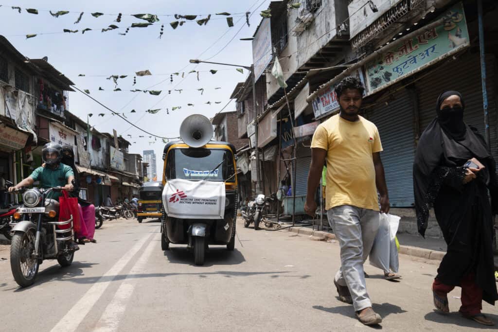 A tuk-tuk used by MSF to spread health promotion messages on how to avoid COVID-19 moves through the lanes of Mumbai’s M-East Ward district. India, May 2021.