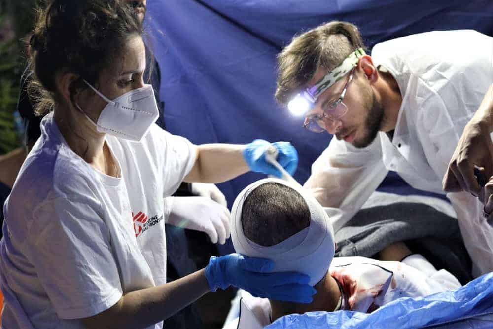A patient at Hôpital Immaculée Conception receives treatment from an MSF physiotherapist, following injuries sustained in the 14 August earthquake. Les Cayes, Haiti, September 2021.