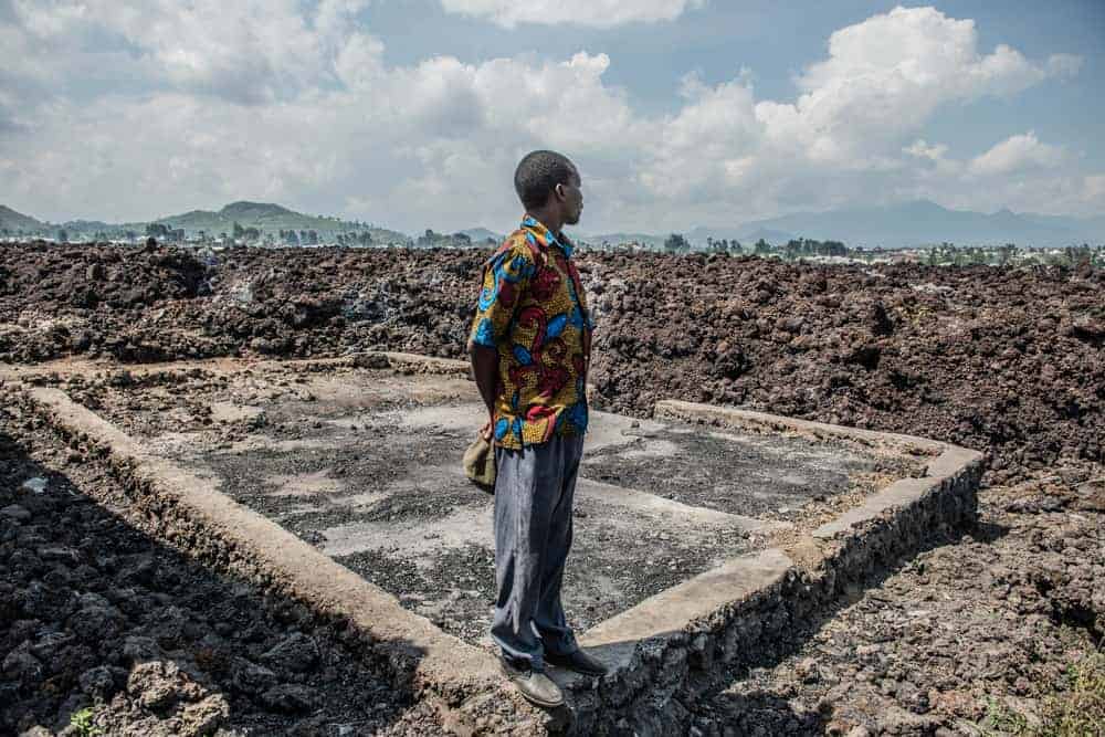Dieudonné surveys the ruined houses in his Goma neighbourhood, destroyed by lava flows following the eruption of the Nyiragongo volcano on 22 May. Democratic Republic of Congo, June 2021.