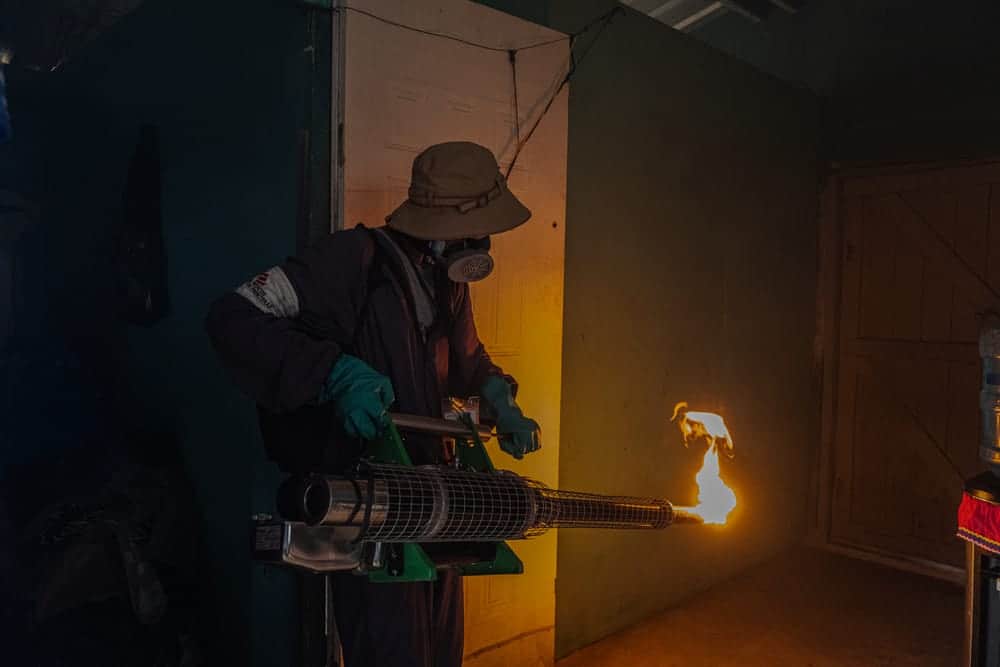 A member of the MSF team sprays for pest control, in the Juan Orlando Hernandez community of Choloma. Honduras, April 2021.