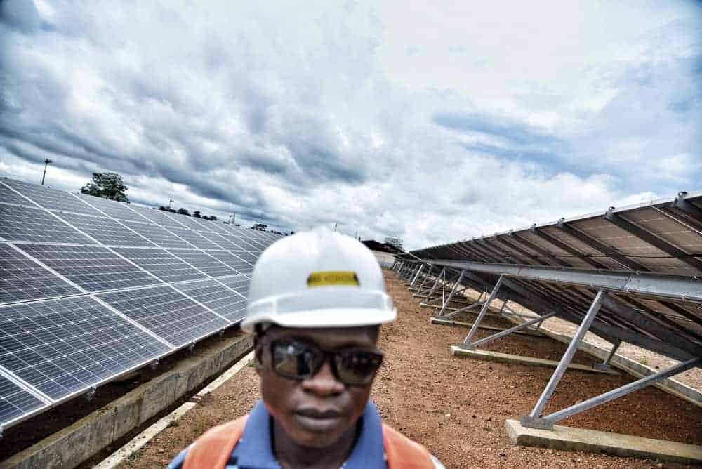 MSF logistics supervisor Mohammed Korma stands amid the solar panels that MSF has installed to run Hangha hospital with clean energy. Kenema district, Sierra Leone, June 2021.