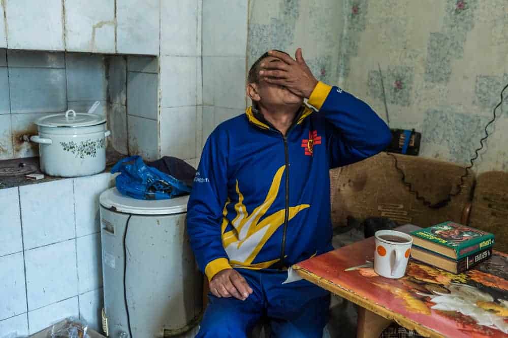 Vitalii swallows his pills to treat drug-resistant tuberculosis at his home in Chudniv village. Zhytomyr region, Ukraine, June 2021.