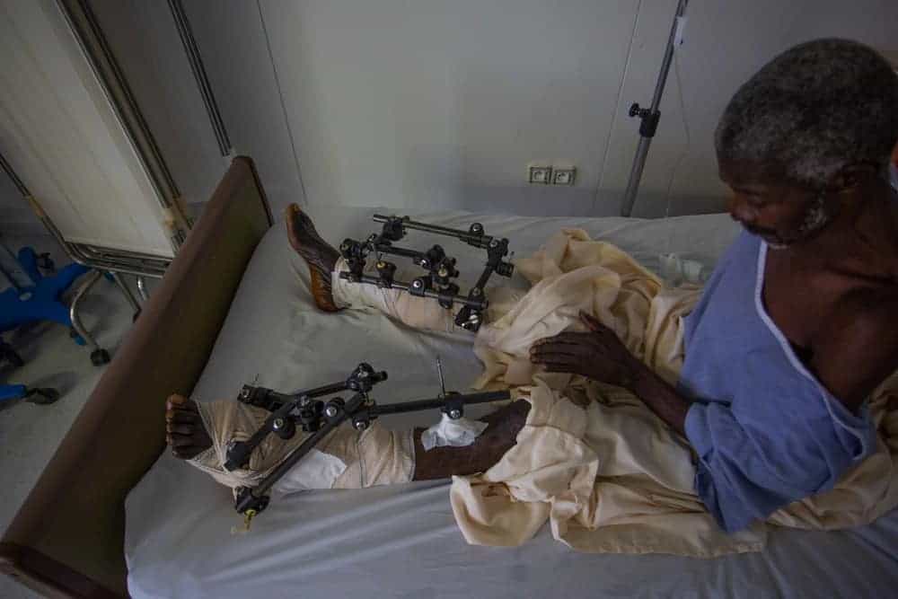 A man looks down at the external fixators on his legs, severely injured during the 7.2 magnitude earthquake on 14 August. Tabarre trauma hospital, Port-au-Prince, Haiti, August 2021.