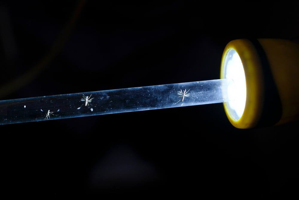 Anopheles mosquitoes caught in a trap are examined by the light of a torch. MSF epidemiologists capture and study the mosquitoes, which transmit malaria, to design strategies to control them and prevent malaria in communities in Sucre state. Venezuela, August 2021.
