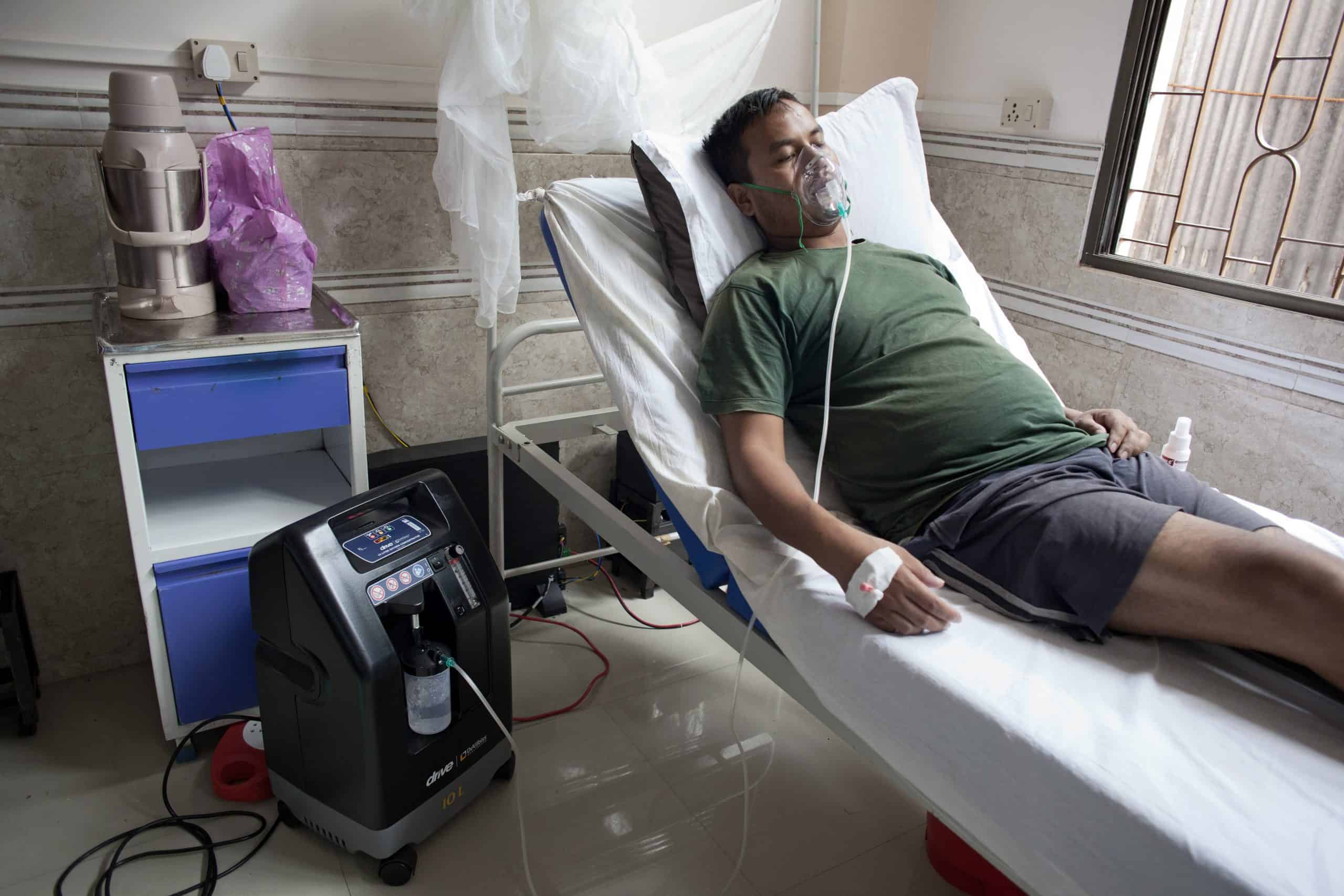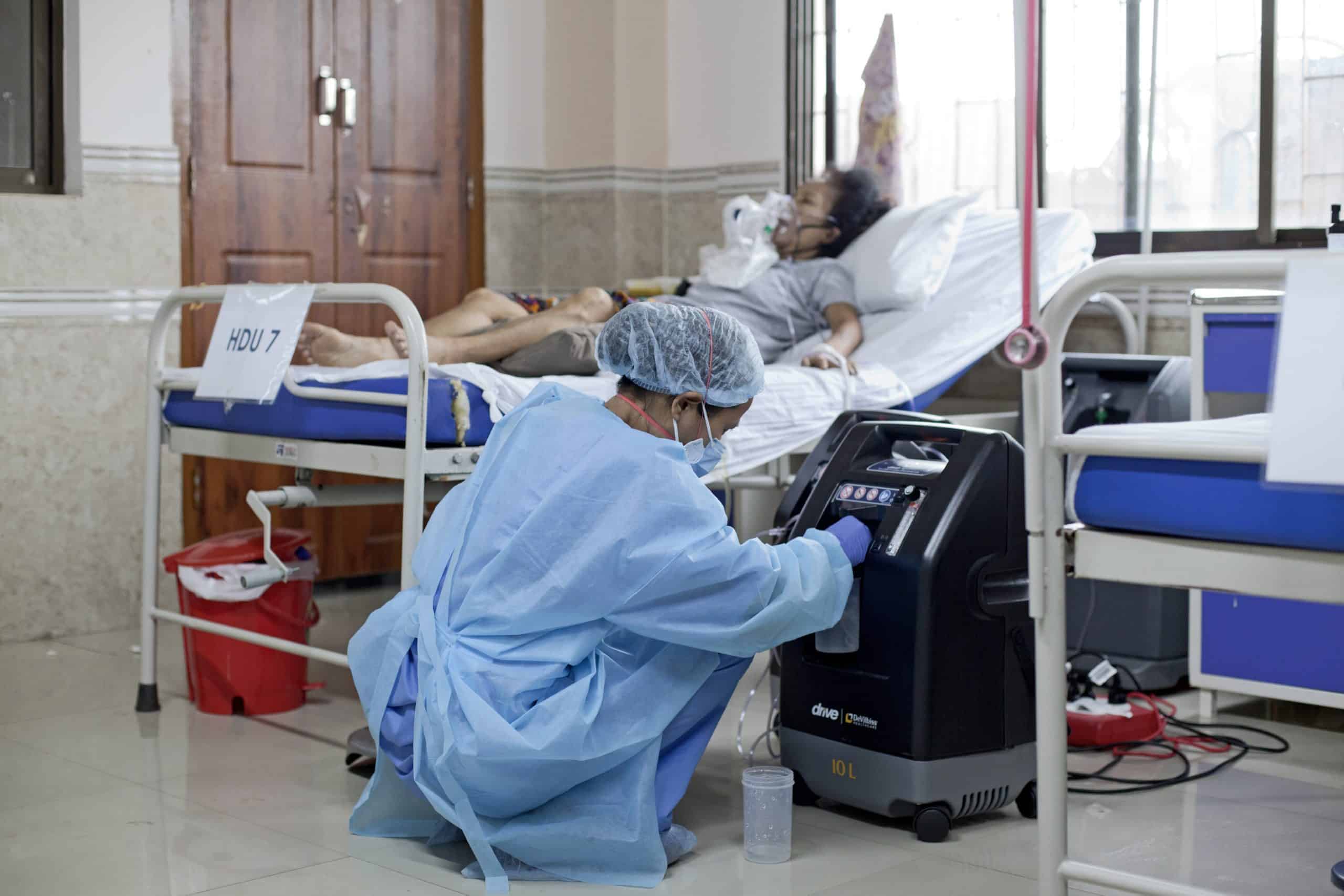 A nurse checks on the workings of an oxygen concentrator at MSF HDU. © Nikhil Roshan