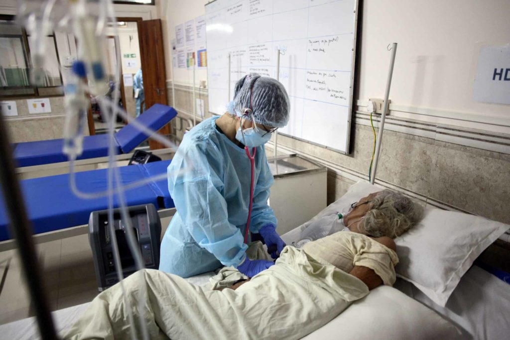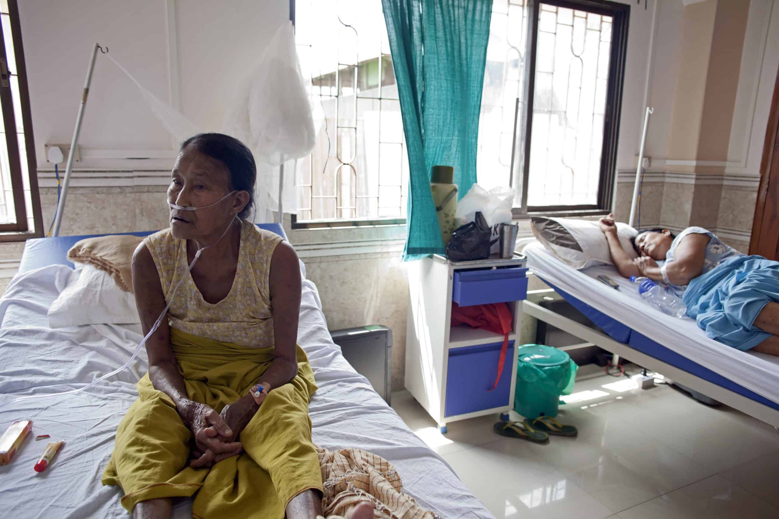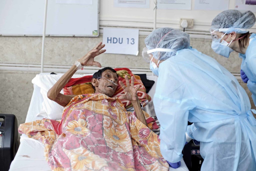 Nurse Heshu Komuni attends to an elderly ailing patient at the MSF HDU on her night shift. Bedside patient support by locally trained nurses and nurse aides was an important part of the response. © Nikhil Roshan