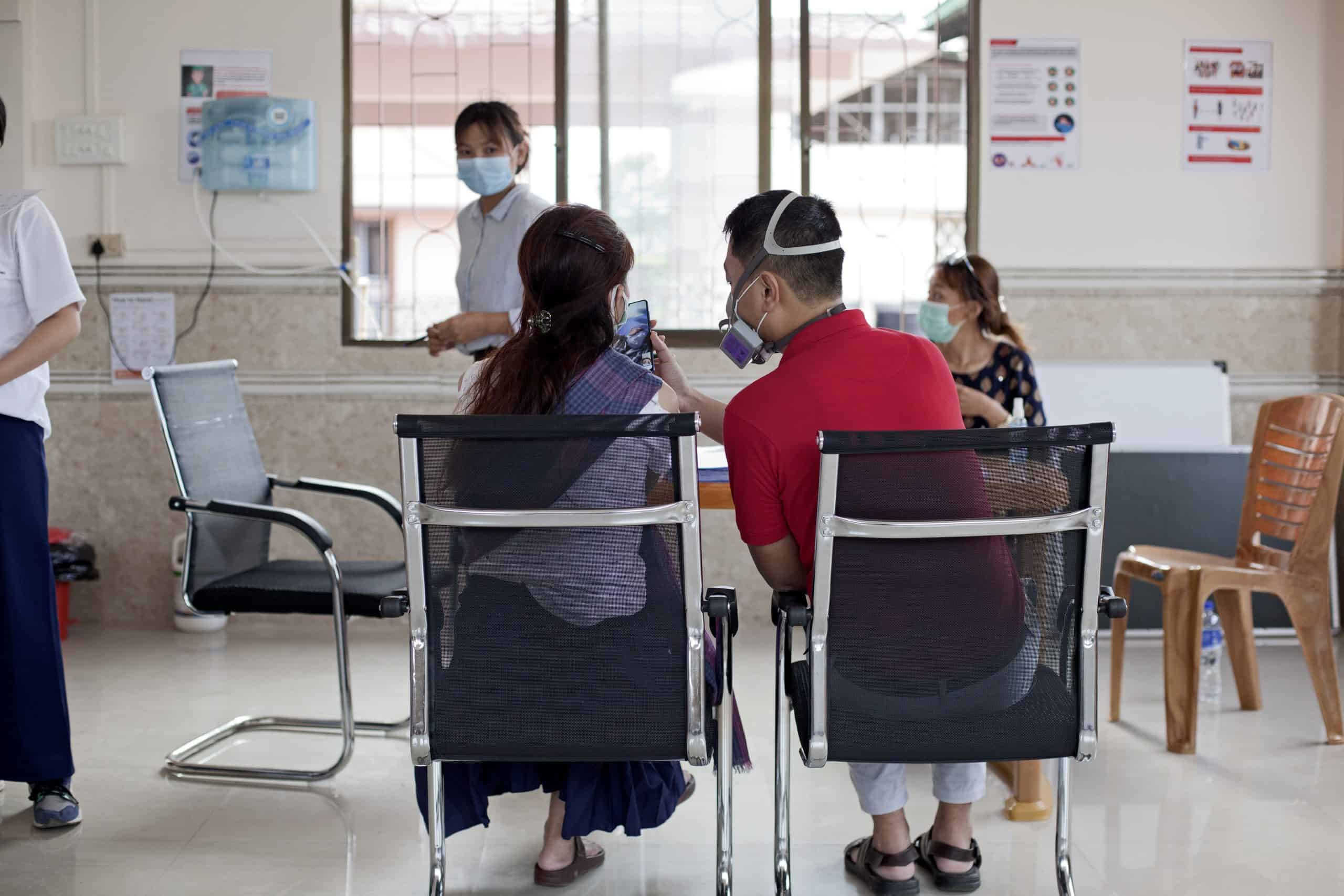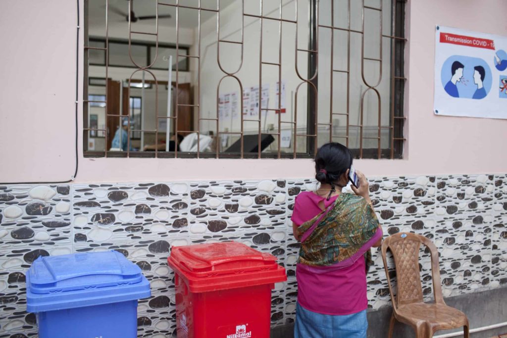 A young couple speak over the phone to their elderly relative who has been admitted to MSF’s high dependency unit (HDU) in Imphal. Entry into the red zone – the section of the HDU with COVID-positive patients – is restricted to MSF nurses and doctors. Caregivers and relatives are provided with a space at the visitors’ section where they can speak to their loved ones over the phone via video chat. © Nikhil Roshan