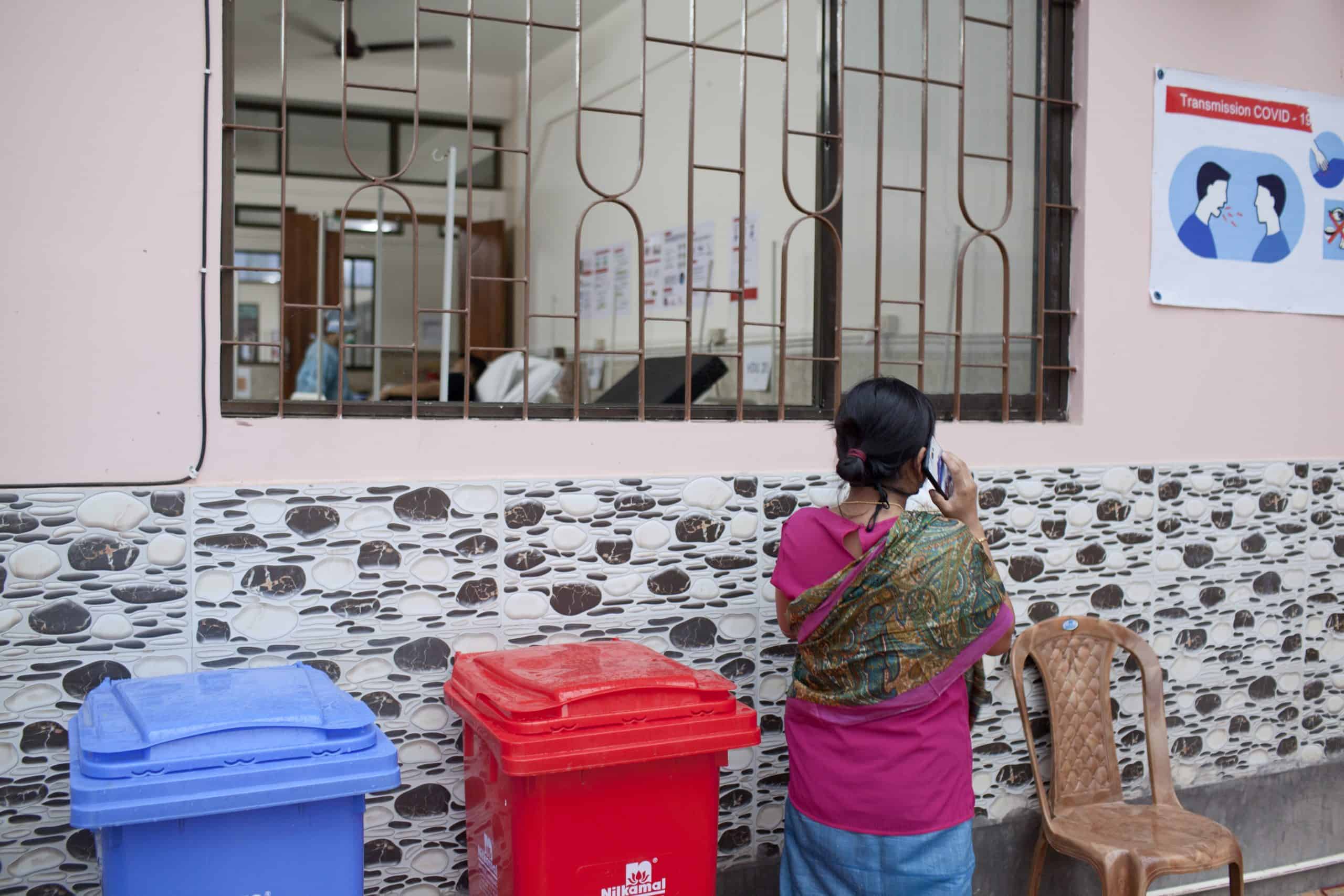 Caregivers and relatives are provided with a space at the visitors’ section where they can speak to their loved ones over the phone via video chat. Doctors and nurses assist elderly patients inside the red zone who often struggle with the technology. Though relieved by the service, the couple were visibly anxious about the fate of their loved one. © Nikhil Roshan