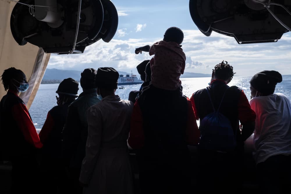 Survivors on the deck of the Geo Barents, looking at the Italian shore and getting excited to arrive on land soon, on November 19, 2021.