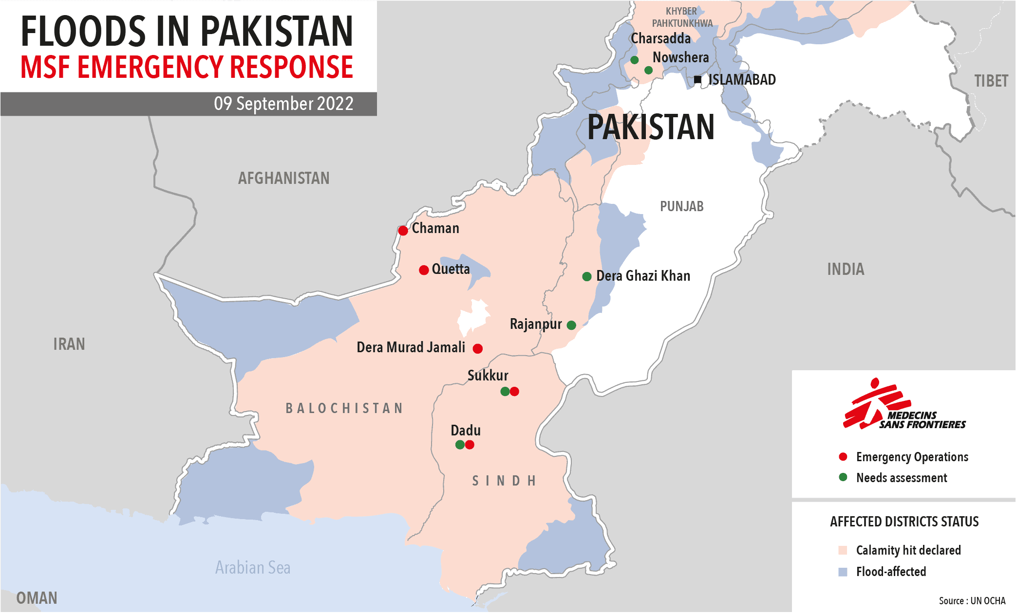 MSF teams are stepping up their support to people affected by the situation and are preparing to intervene quickly in case of outbreaks. MSF teams responded quickly to the flooding after the Government declared a state of emergency on 26 August, and mobile clinics providing primary healthcare and health promotion activities were put in place, and there were distributions of clean drinking water, non-food items, and hygiene and mosquito nets in Dera Murad Jamali, Quetta and Chaman in Balochistan province.